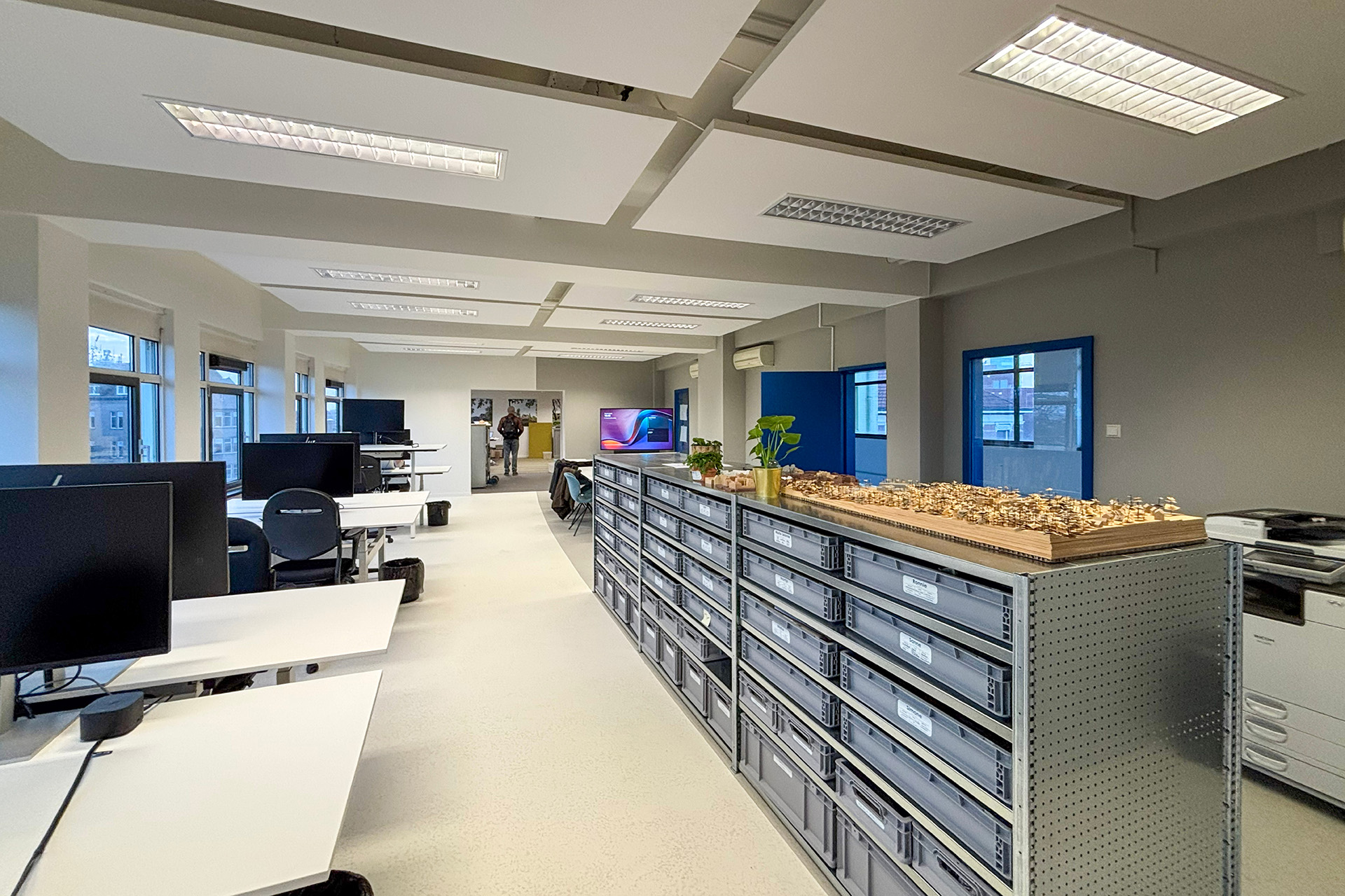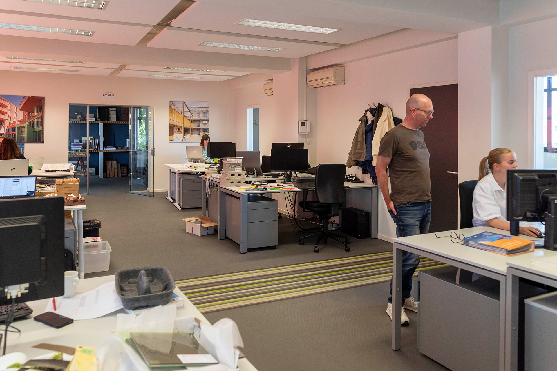 Met minder werkplekken is er nu ook ruimte voor ‘anders’ werken. Aanland-, bel- en concentratie plekken, een maquetteruimte, nieuwe keuken, sanitair, stamtafel en archibar. Alles in dienst van de dynamiek en diversiteit van ons team en onze projecten.