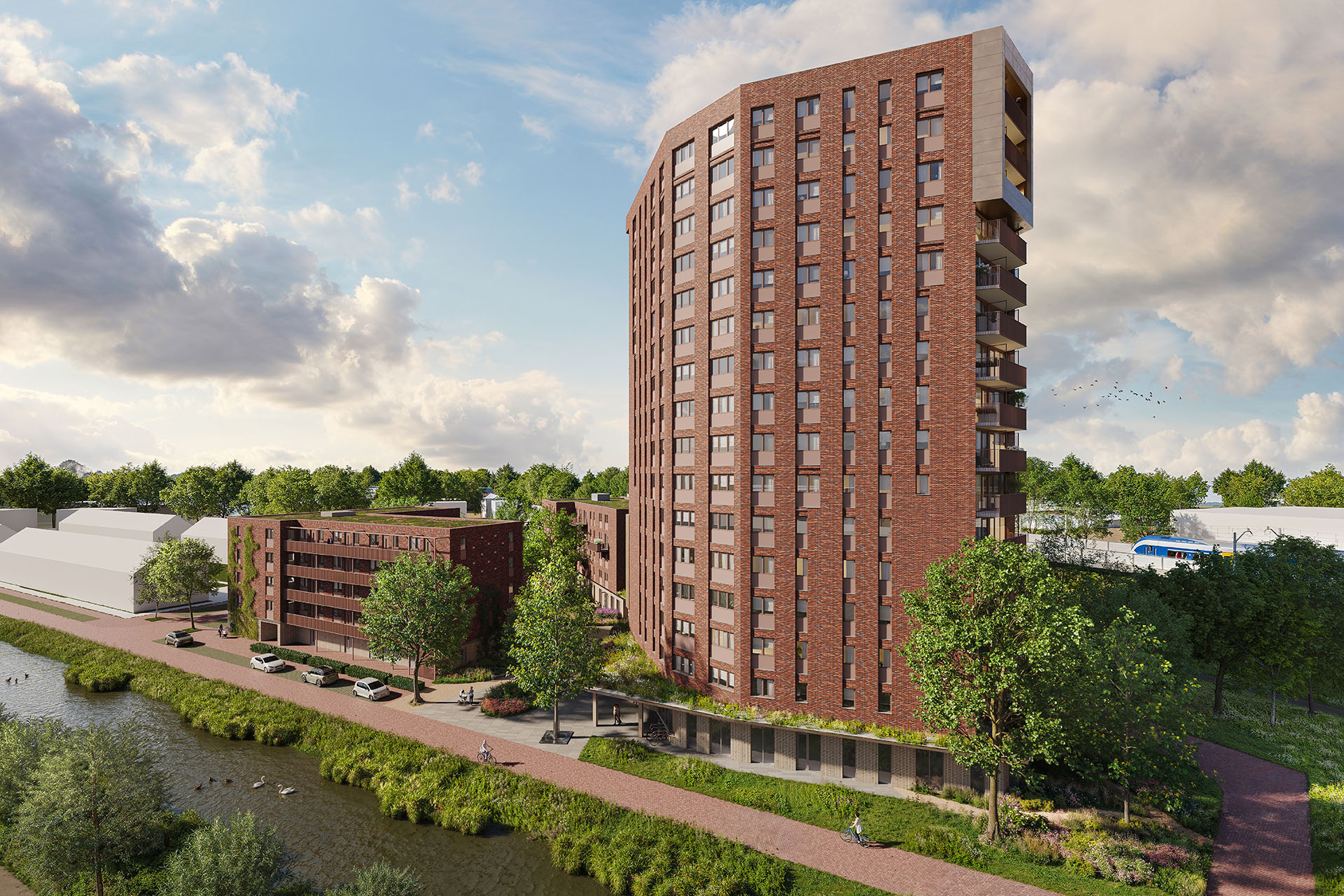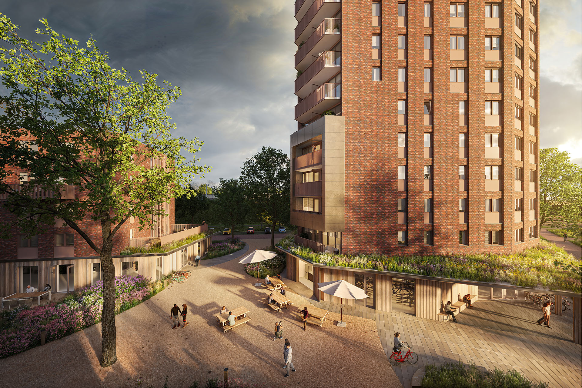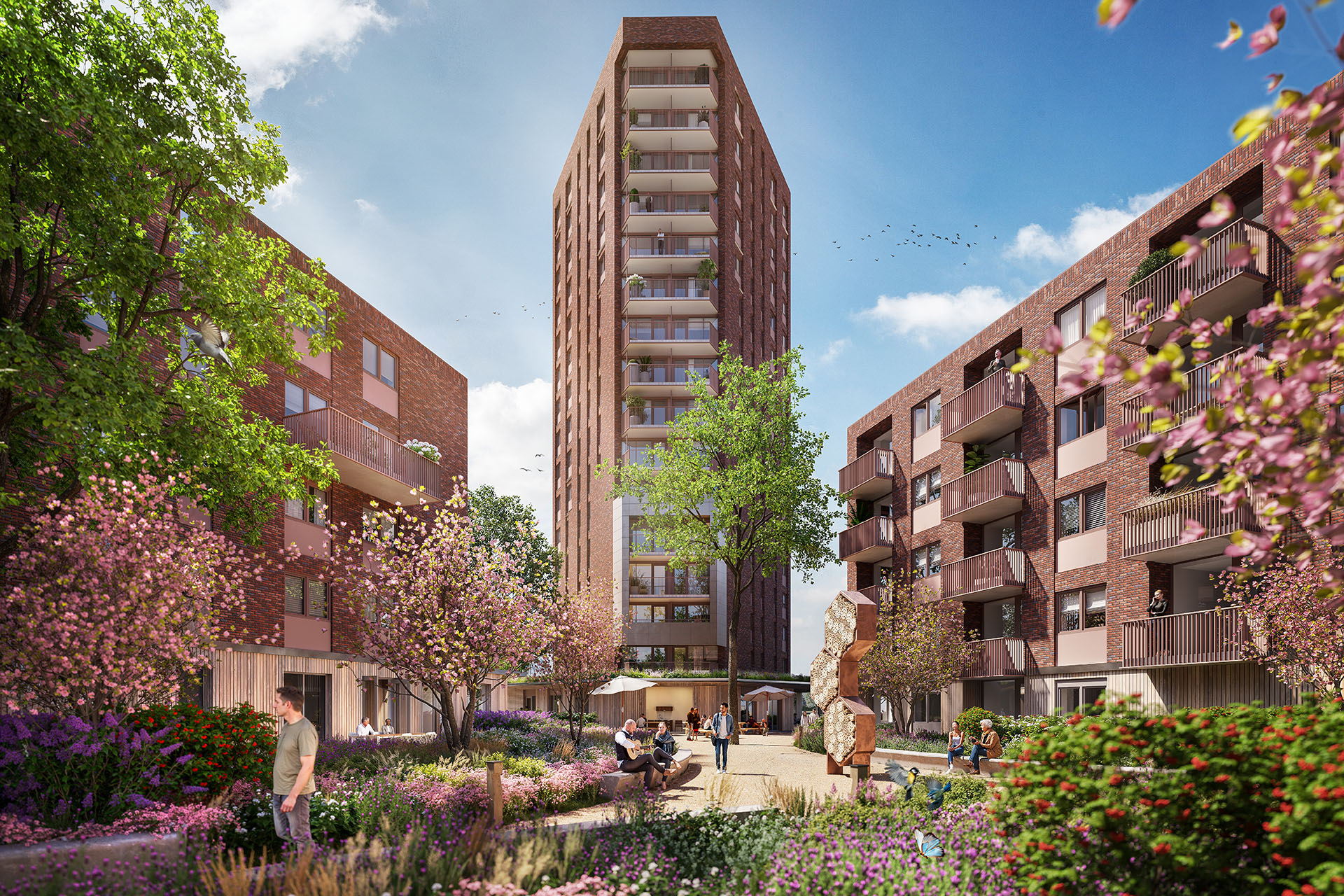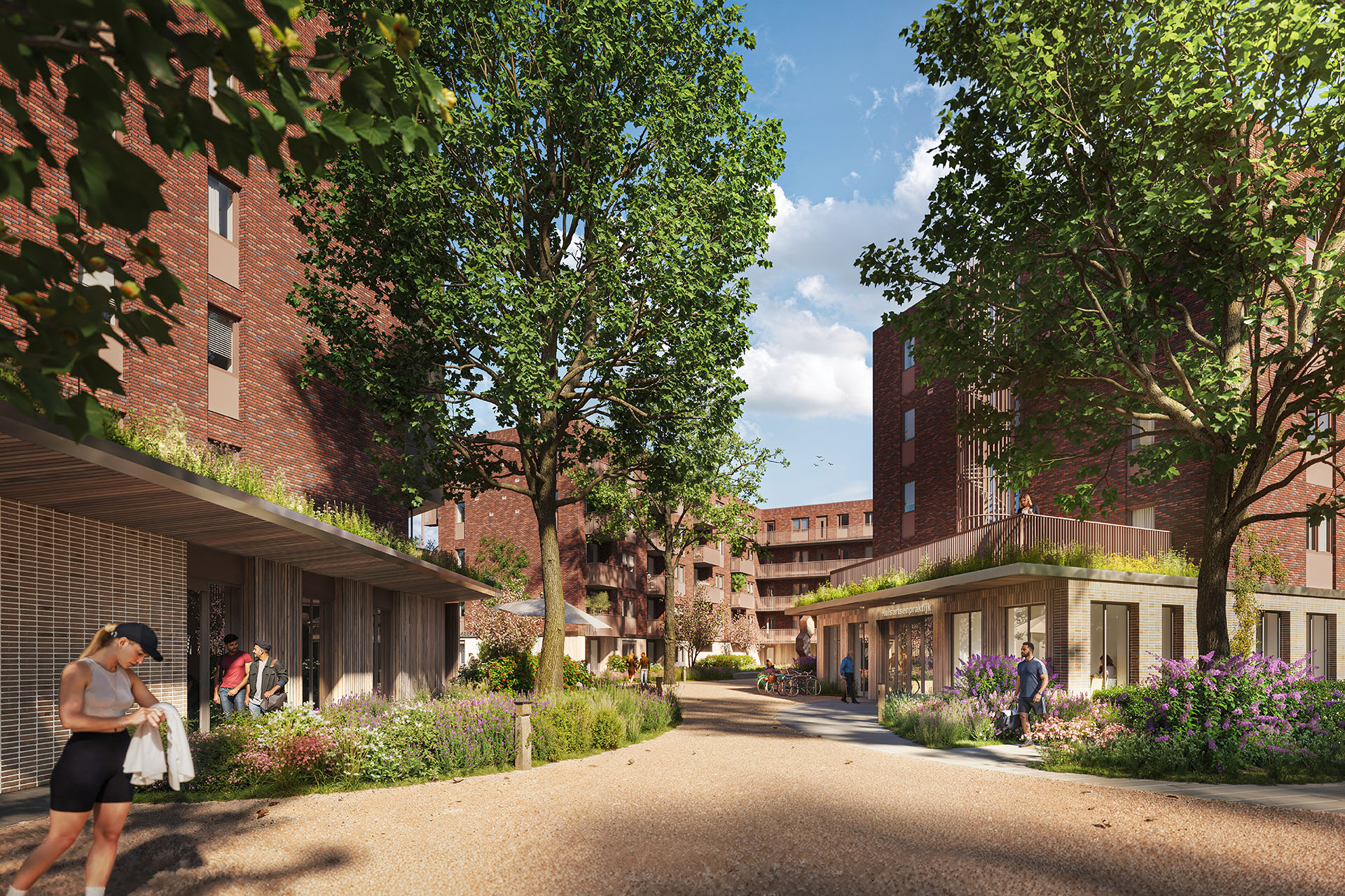De ruimte tussen de drie gebouwen wordt vormgegeven als een groen hofje en vormt een eigen, rustige wereld: een groene oase met organische vormen, lage meerstammige bomen en weelderige beplanting. Hieraan wonen de huurders van Volkshuisvesting en RIBW, ligt de entree van de huisartsenpraktijk en de collectieve buitenruimten voor de bewoners. Beschut en collectief wonen met stedelijke allure.