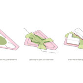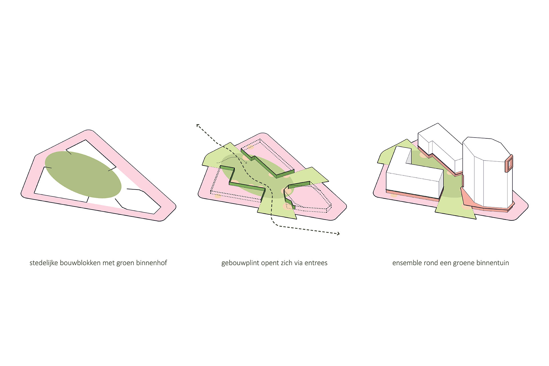 De drie gebouwen vormen stedenbouwkundig en architectonisch een ensemble. In massa verschillend, in architectonische taal één geheel.