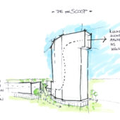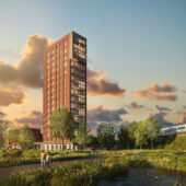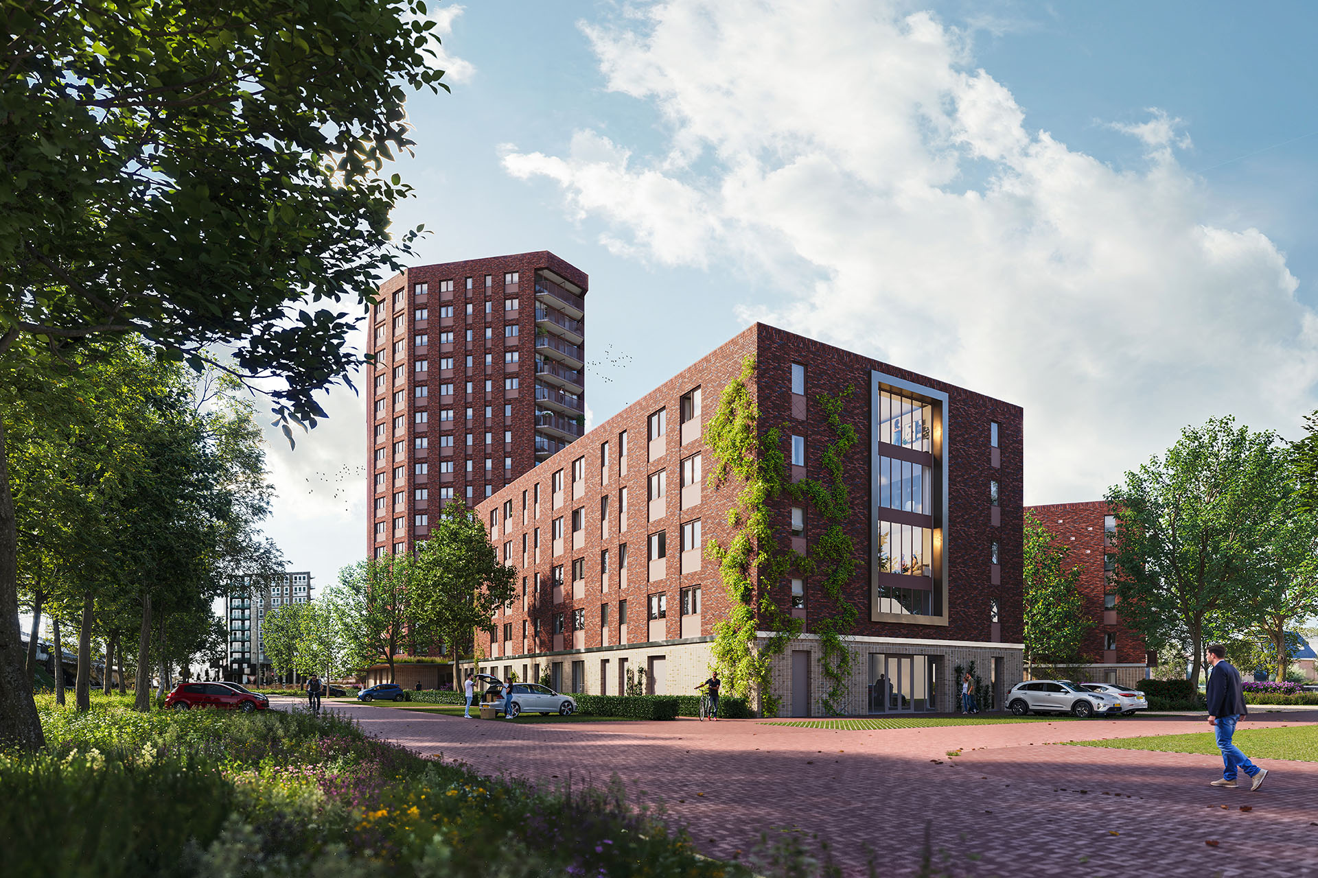 De gevels van de verdiepingen krijgen een rijke uitstraling met donker roodbruin gemêleerd metselwerk. De toren krijgt diepe negge’s, waarin terugliggend metselwerk subtiele accenten aanbrengt, gecombineerd met beigegrijze borstweringen en donkere puien.