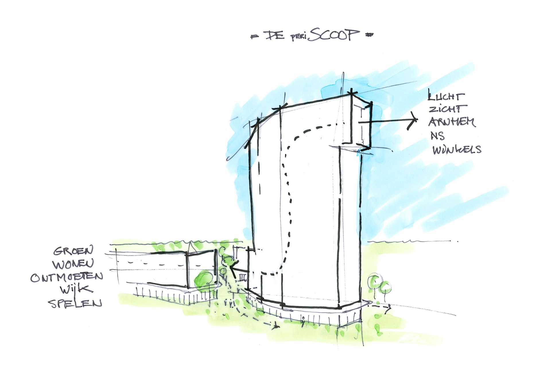 De naam ‘De Periscoop’ is een knipoog naar de vorm van het gebouw en het weidse uitzicht voor bewoners. Hier markeert de Periscoop de stedenbouwkundige entree van Schuytgraaf. De hoge kijker geeft schaal en de Arnhemmer kan zich binnen de stad beter oriënteren. Arnhem Zuid is beter zichtbaar vanaf de bruggen over de Rijn en bewoners van de Periscoop overzien het rivieren- en stuwwal landschap met de eeuwenoude Eusebius.
