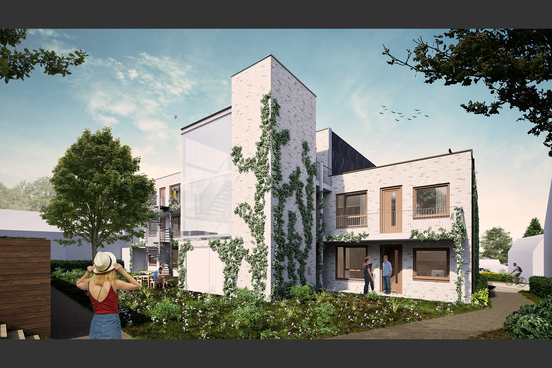 Aalten kent een bijzonder patroon van Middeleeuwse gängeskes: kleine sluipweggetjes tussen de dorpsstraten en de achtertuinen. Aan de westzijde van de kavel wordt een nieuw gängeske gecreëerd. Dit steegje leidt de voetgangers en fietsers van de Hogestraat naar de hoger gelegen collectieve binnentuin, waar zich de entree en bergingen bevinden, en naar het weer daarboven gelegen eigen parkeerterrein aan de Hoven. Het steegje wordt vergroend door aan wederzijdse hagen te introduceren.