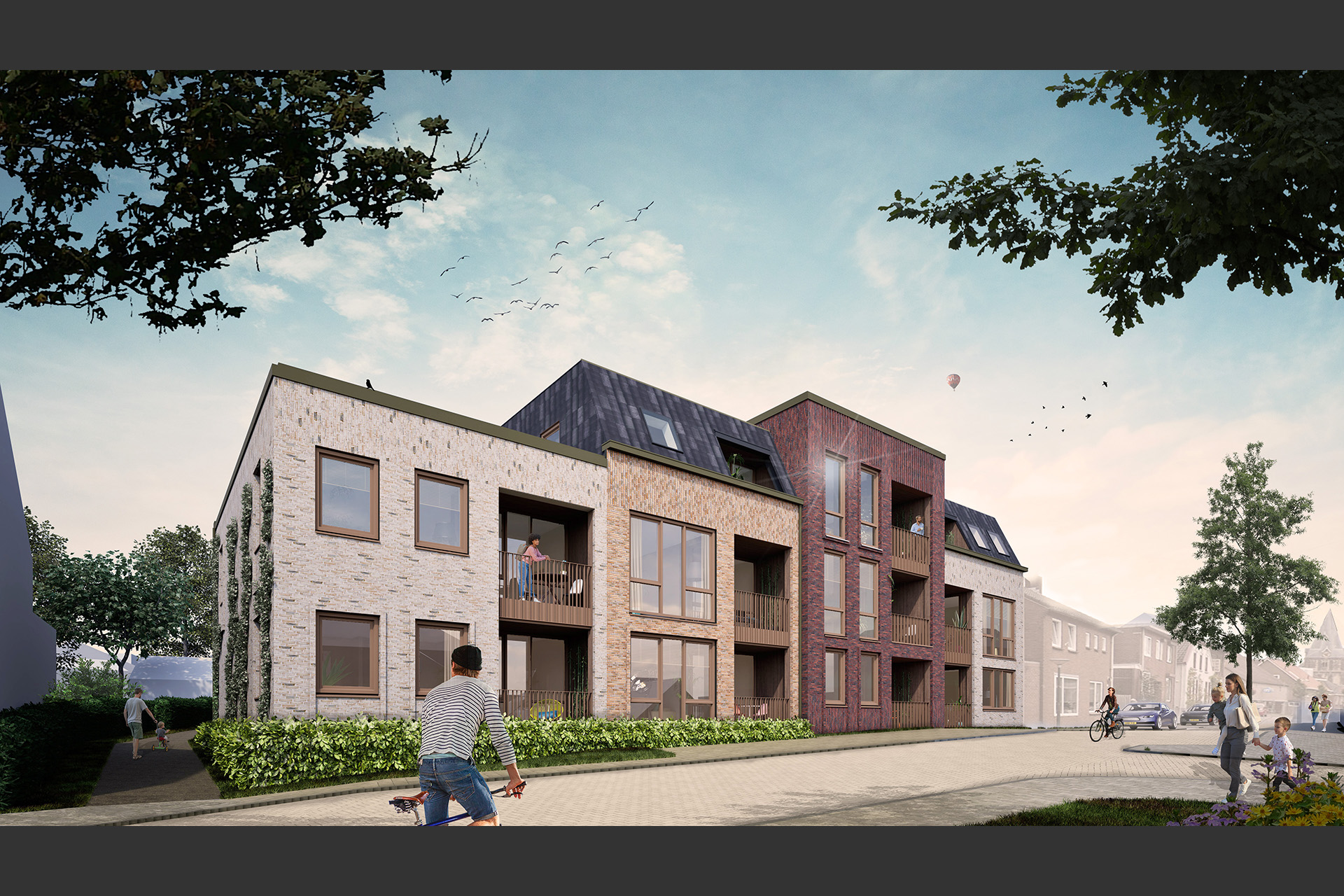 Om aan te sluiten bij de dorpse, pandsgewijze bebouwing in de omgeving is er gekozen om de gevel op te breken. Dit doen we door sprongen in de gevel te introduceren en daarnaast variatie aan te brengen in hoogte en dakvormen. De hierdoor ontstane volumes krijgen hun eigen sfeer in kleur, textuur, hoogte, kozijnengrootte en detaillering. De schuine kappen zijn prominent aanwezig.