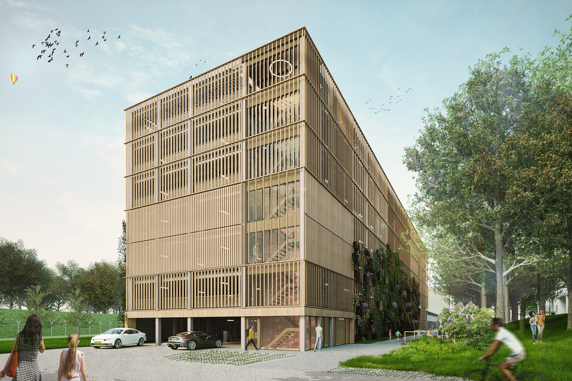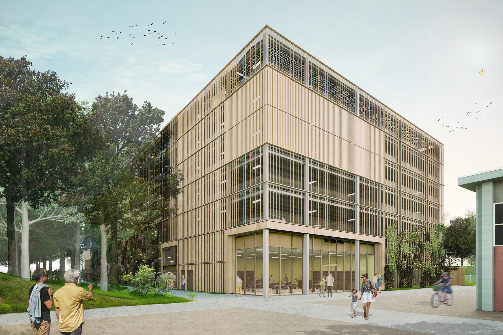 ontwerp voor de mobiliteitshub met 450 parkeerplaatsen, commerciële ruimte en energiehub