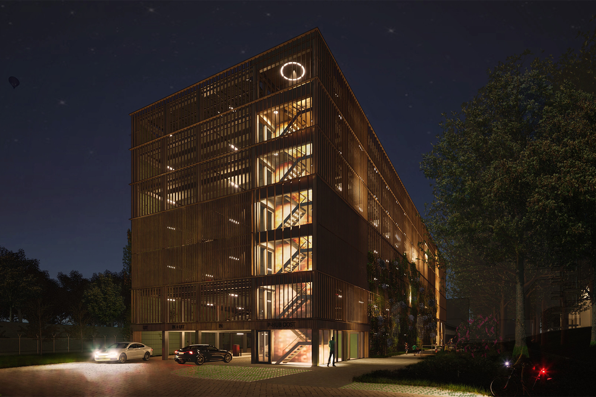 Op de plek van de oorspronkelijke energiecentrale is door opZoom het ontwerp gemaakt voor de nieuwe mobiliteitshub. In deze hub bevinden zich 450 parkeerplaatsen, een commerciële ruimte en de nieuwe energiehub. In het gebouw zijn de inkoop, trafo, laagspanningsruimte én de centrale WKO installatie opgenomen en wekt het gebouw met ca. 650 pv panelen de energie op voor de appartementen van het in het bomen carré gelegen zuidelijk cluster.