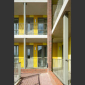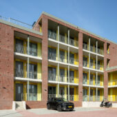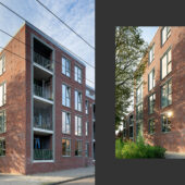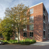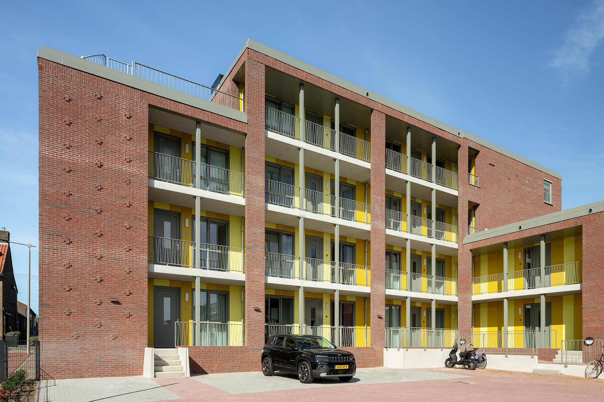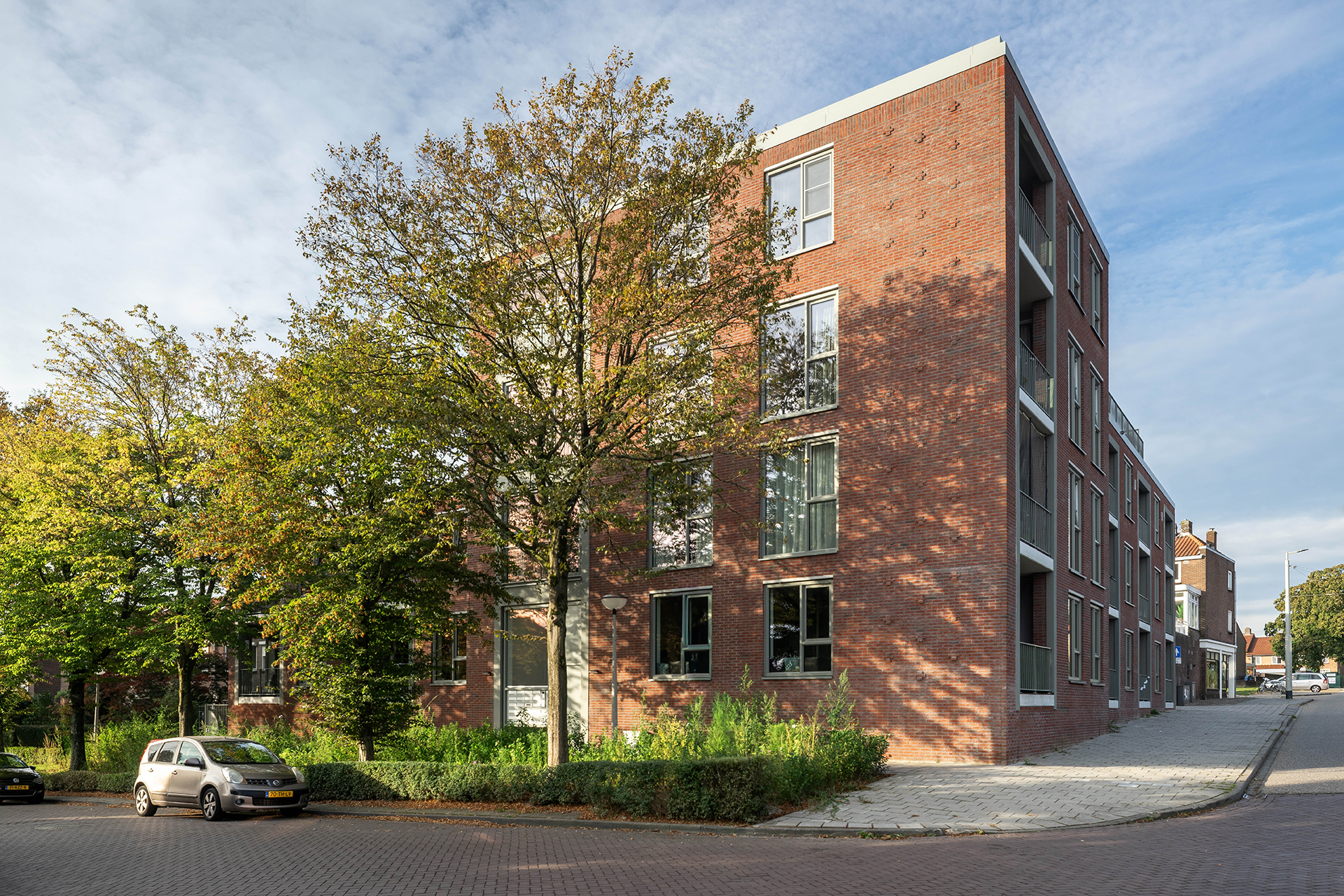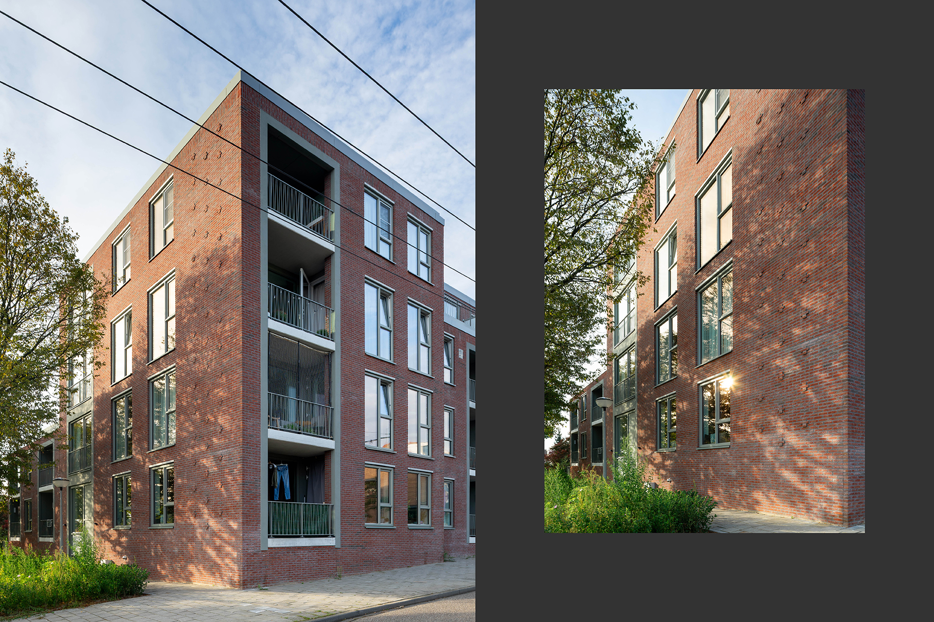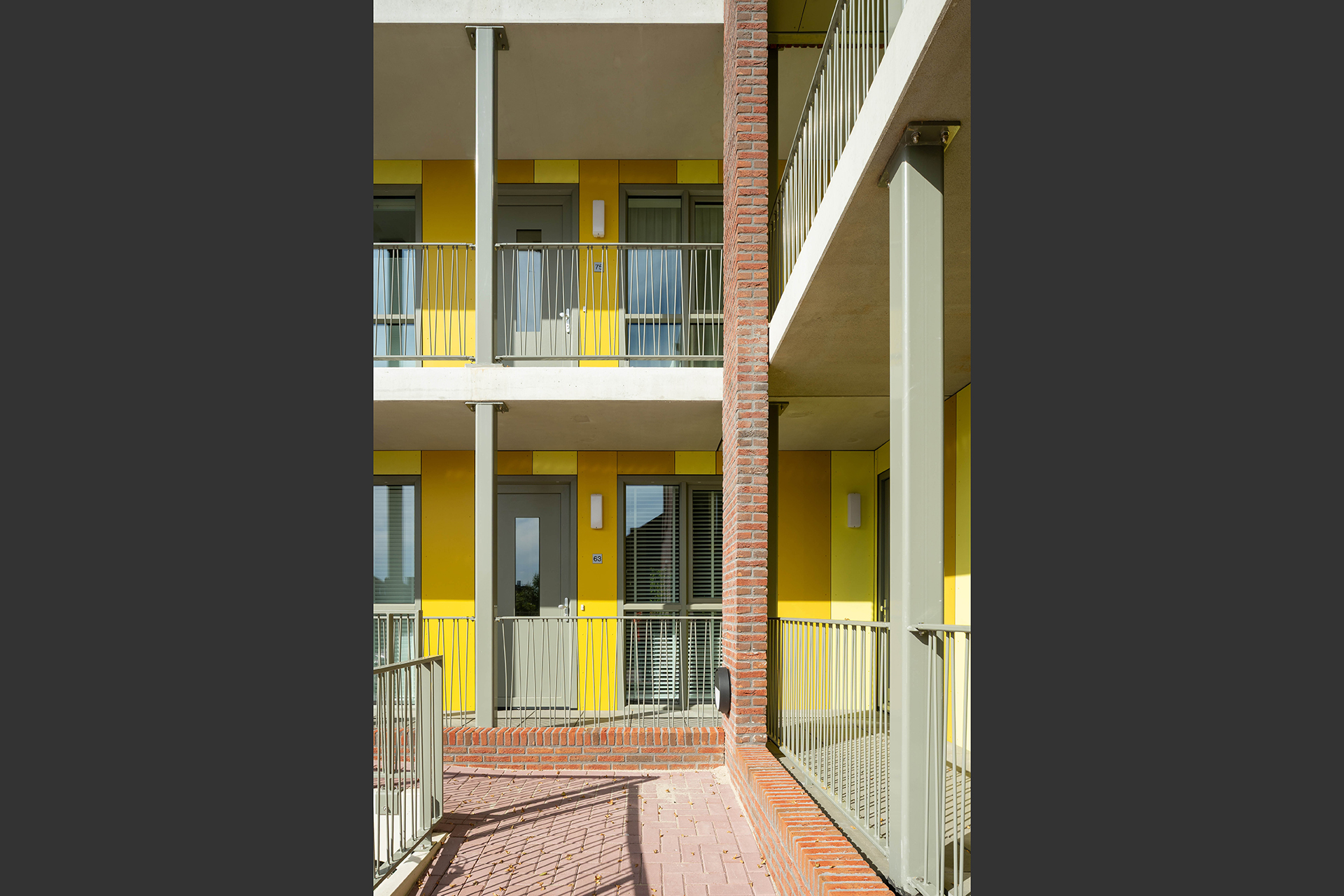 Het ontwerp heeft een eigentijdse uitstraling met een knipoog naar de kenmerkende architectuur uit de jaren vijftig. Ingrediënten die we hebben toegepast zijn onder andere: een verhoogde begane grond, gespiegelde woningen voorzien van balkon of loggia, metselwerk accenten, expressieve kopgevel, grote gevelopeningen en accenten in de gevel door middel van een kader. Voor het metselwerk is gekozen voor een oranje rood gesinterde baksteen. De binnenwereld heeft een eigen karakter met een tweede huid van gevelbeplating in ton sur ton geeltinten.