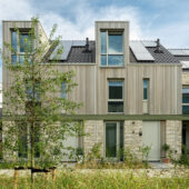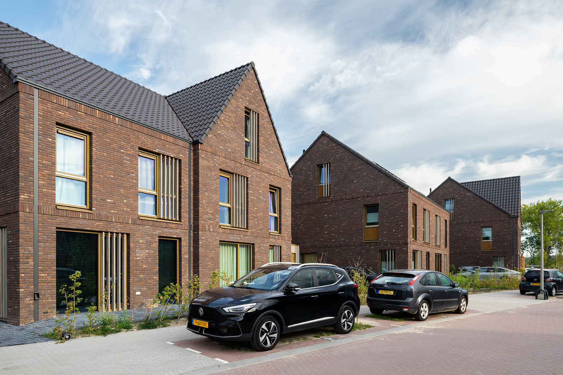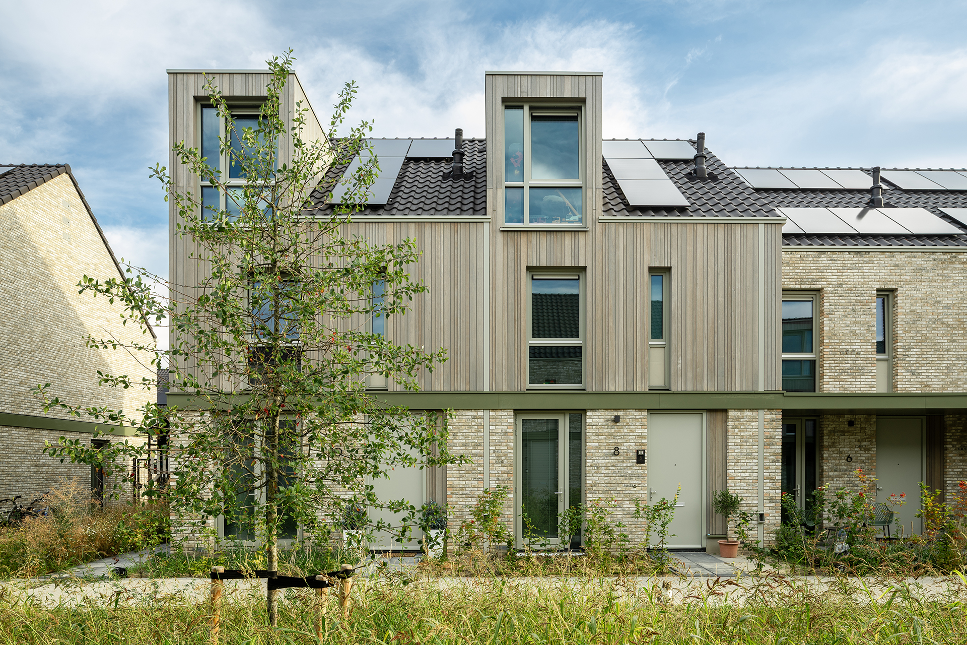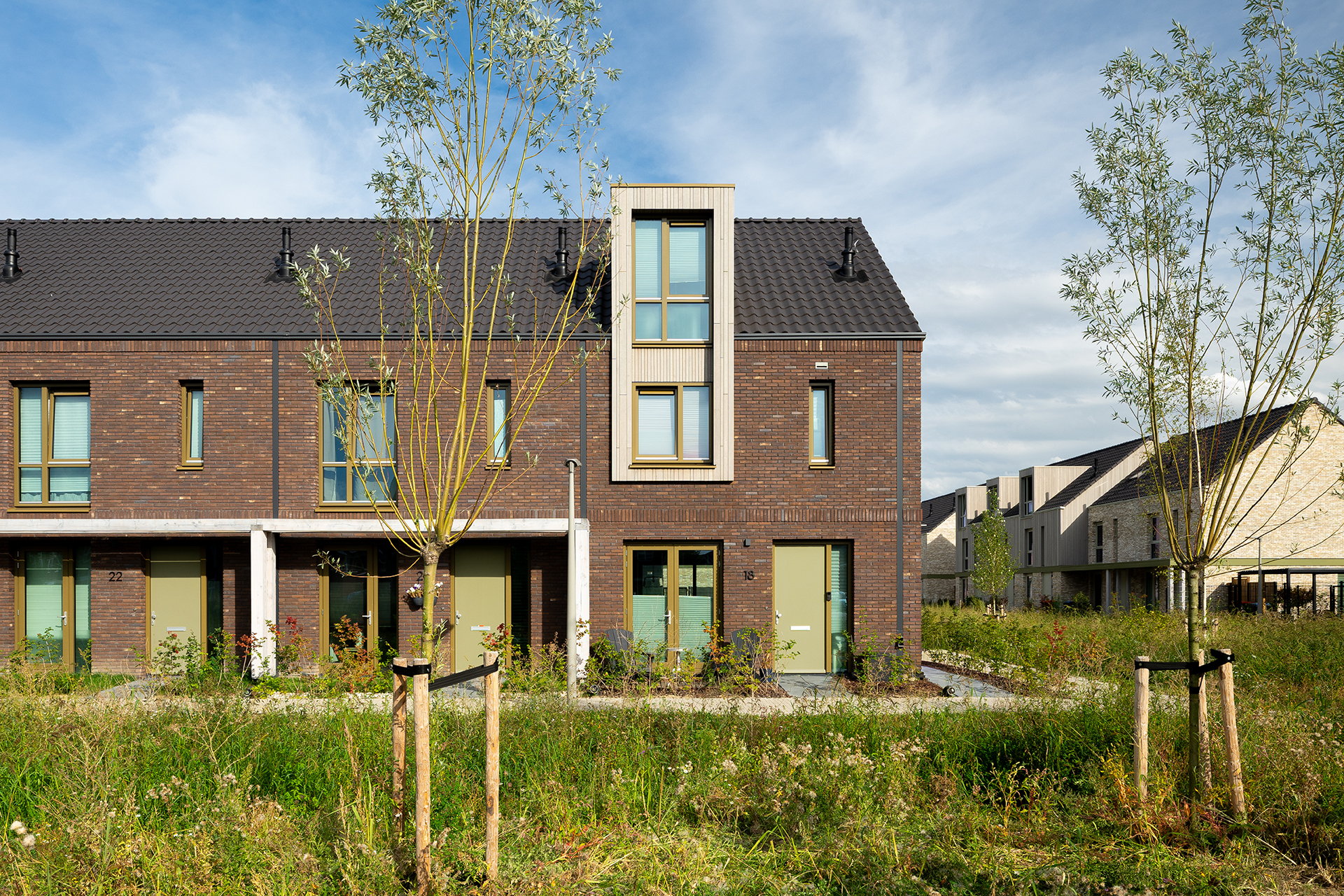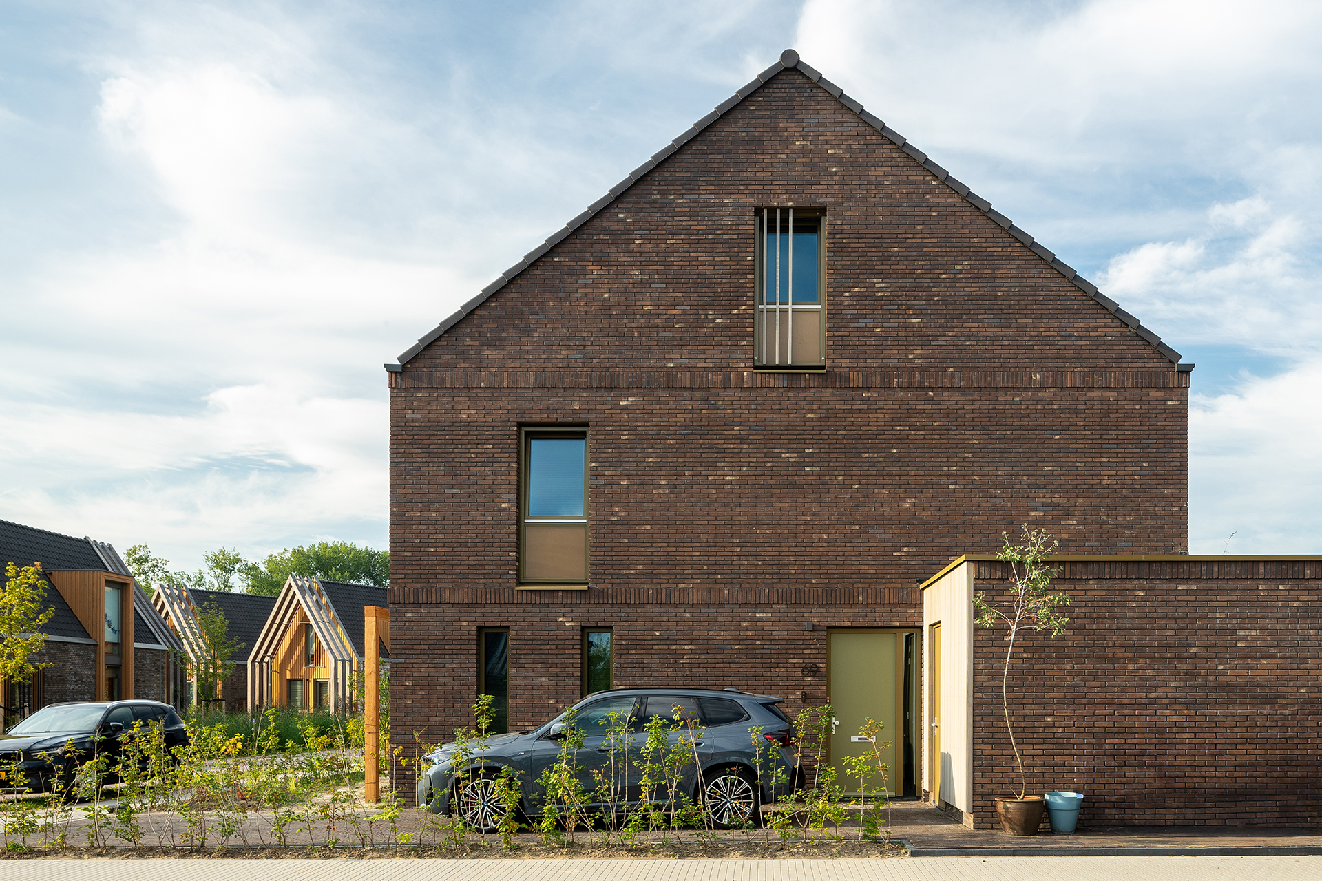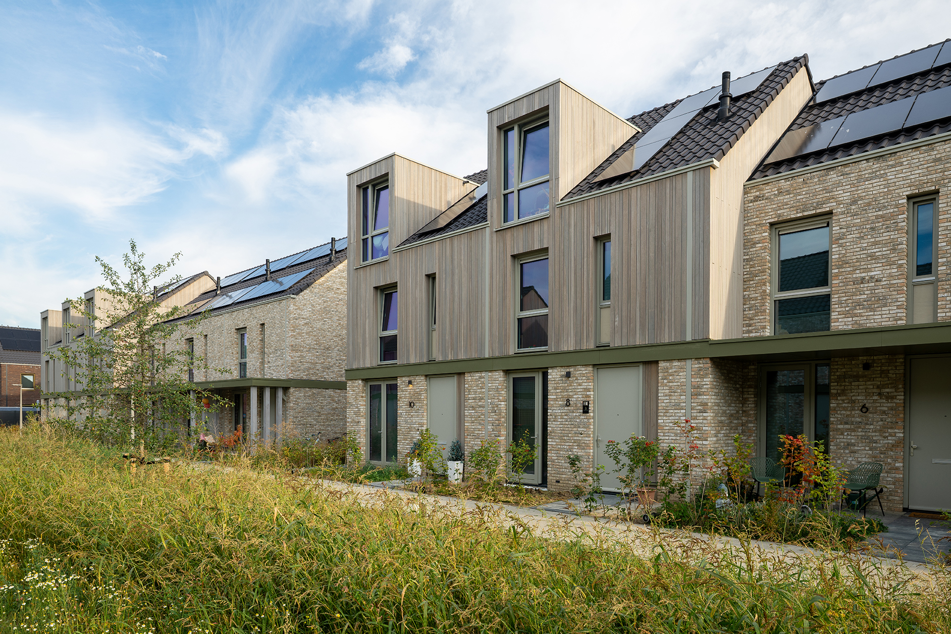 De in grootte afwisselende woningen in het autoluwe hart van Overbos, de groene wig, zoeken het contrast op. Ze zijn speels, groen en licht. De sprong in de gevellijn maakt het geheel nonchalant en creëert ruimte voor de veranda’s. Deze maken integraal deel uit van het ontwerp en zijn een groen verlengstuk van de woonkamer. De eigenwijze Vlaamse gevels dragen bij aan het speelse karakter. Het beige-groen gemêleerde metselwerk en de voorvergrijsde houten gevelbekleding zijn licht van kleur en duurzaam.