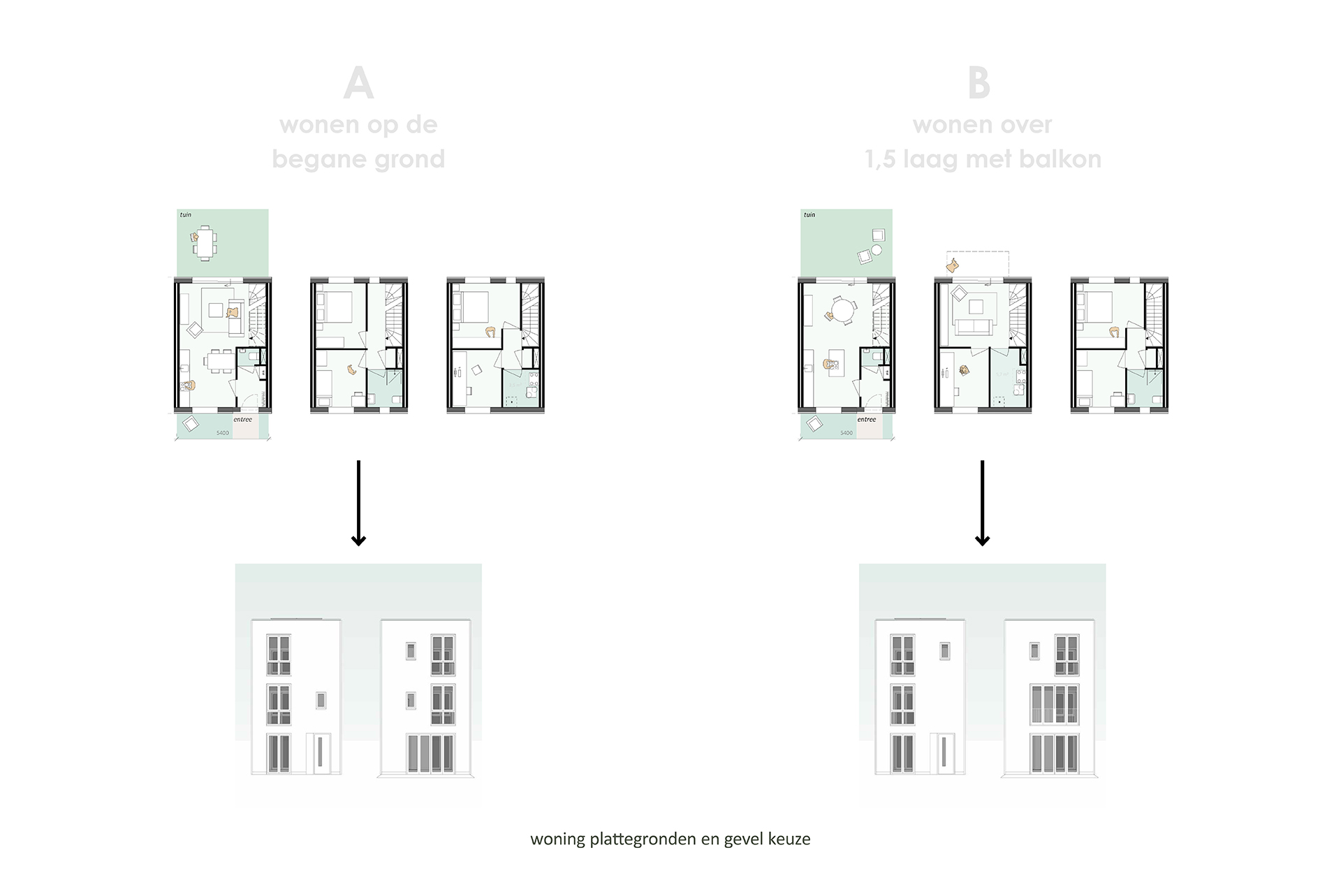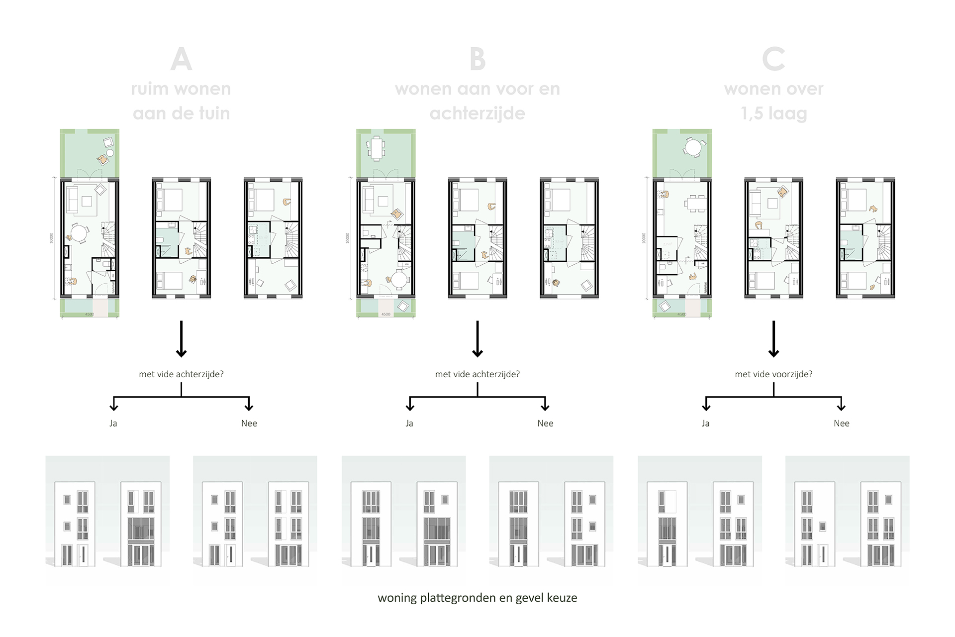 Een bouwvolume van drie woonlagen met een vaste positie voor schachten en techniek wordt gebruikt als basis. Doordat met deze opzet een verder flexibele plattegrond ontstaat, volgt een menu aan keuzes voor de koper. Een toekomstige bewoner kan zo meebeslissen hoe ze willen wonen: wonen of koken aan de tuin of over 1,5 verdieping? Is er behoefte aan meer slaapkamers of woonruimte? Om de koper een handje te helpen, zijn er voor beide woonrijtjes verschillende woningplattegronden ontworpen. Vanuit hier kan de koper zijn woning verder gaan samenstellen.